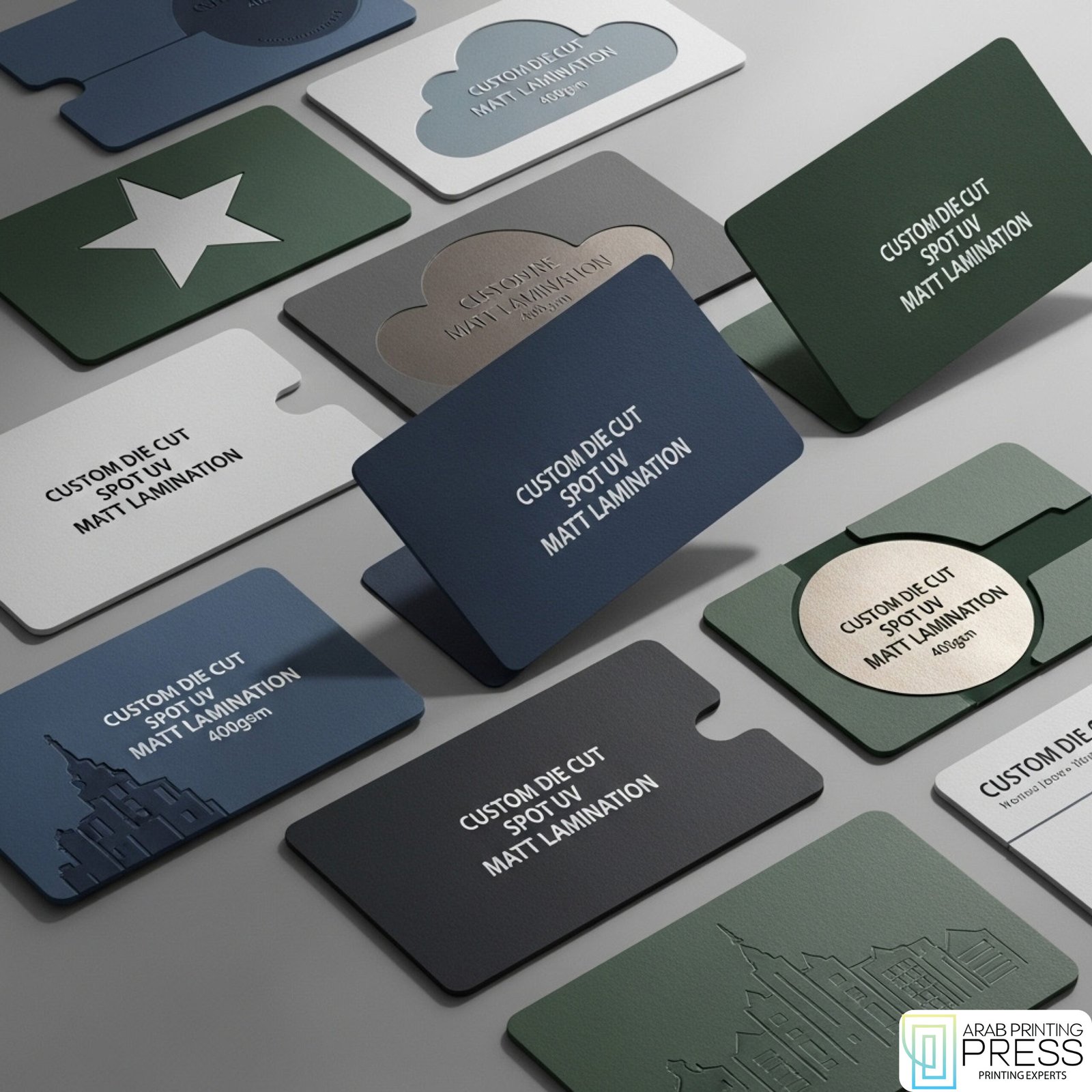 4 Color, 2 Sides, Custom Die Cut Gold Foil Spot UV Matt Laminated 400 gsm, Before Cutting: 9.2 x 5.7cm , After Cutting: 9 x 5.5 cm also you can print in larger sizes up to 34 x 46 cm